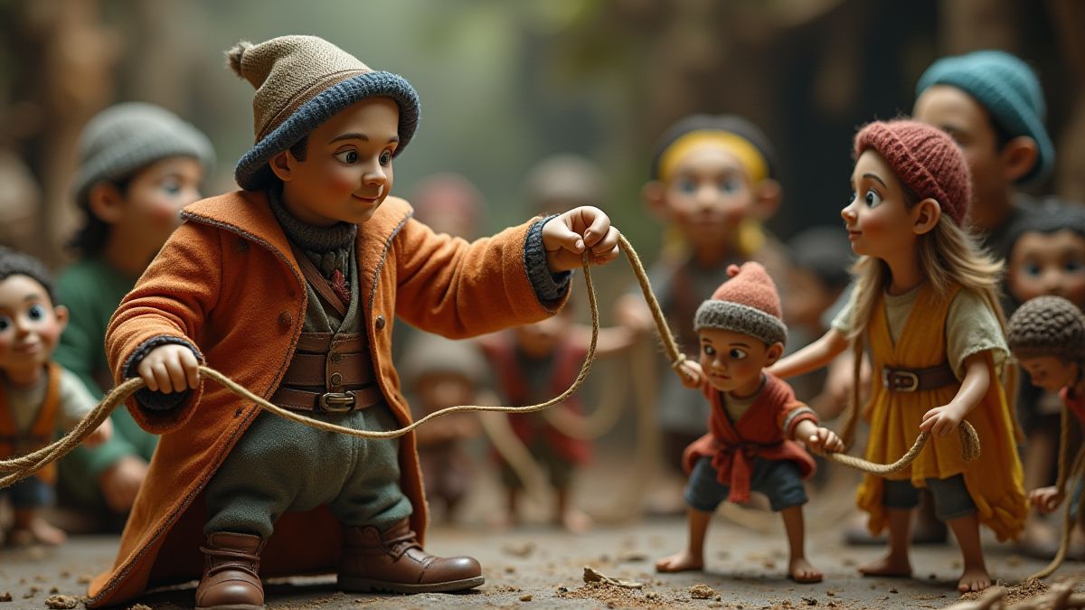 Inhabitants of Lilliput tying ropes around Gulliver's arm.